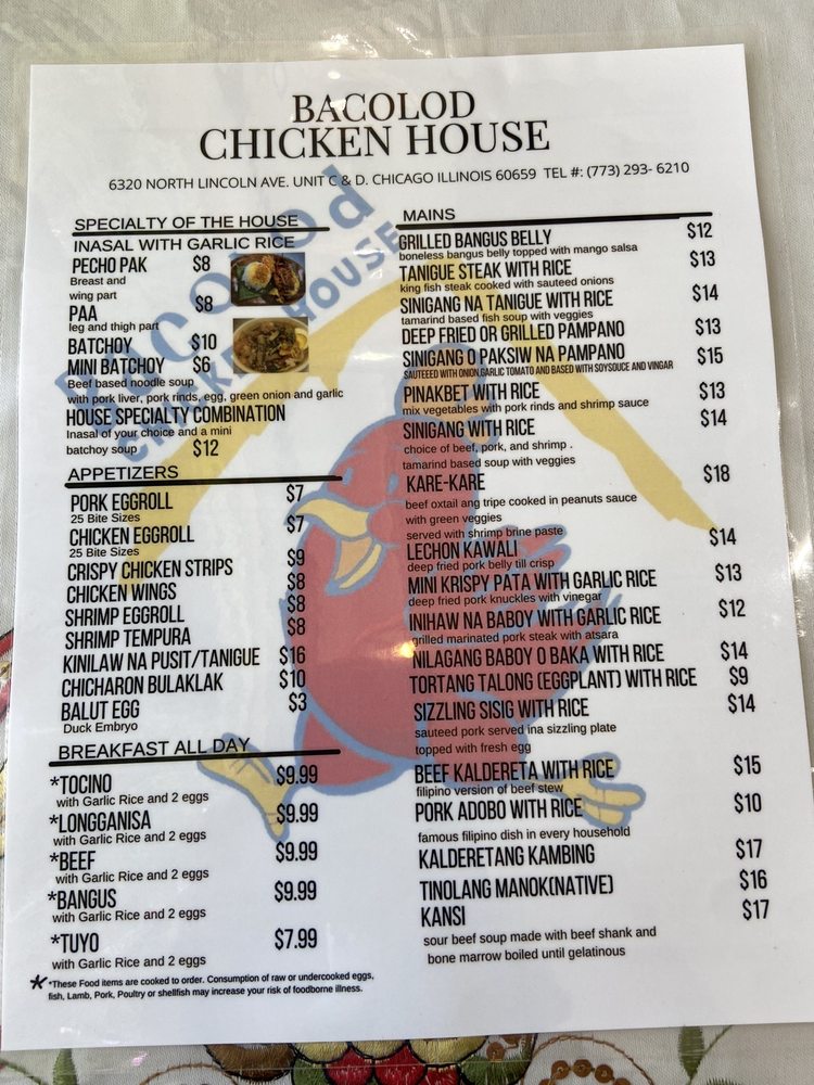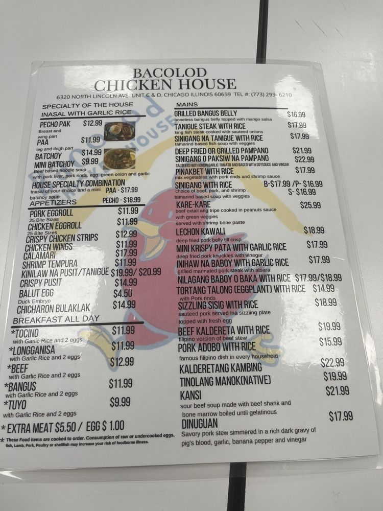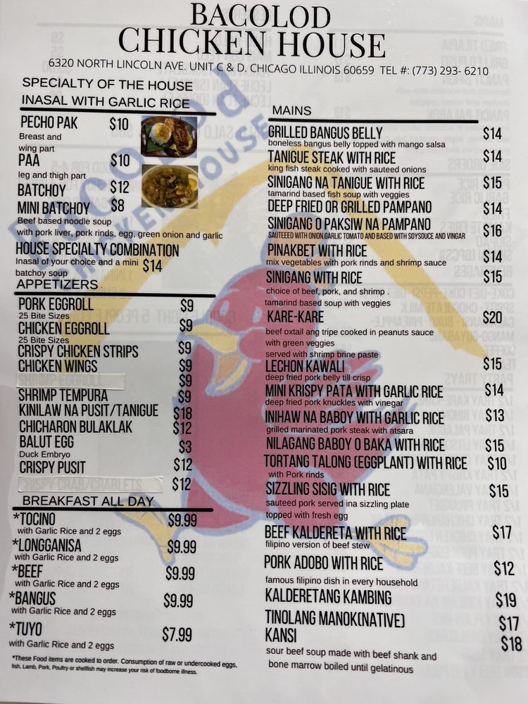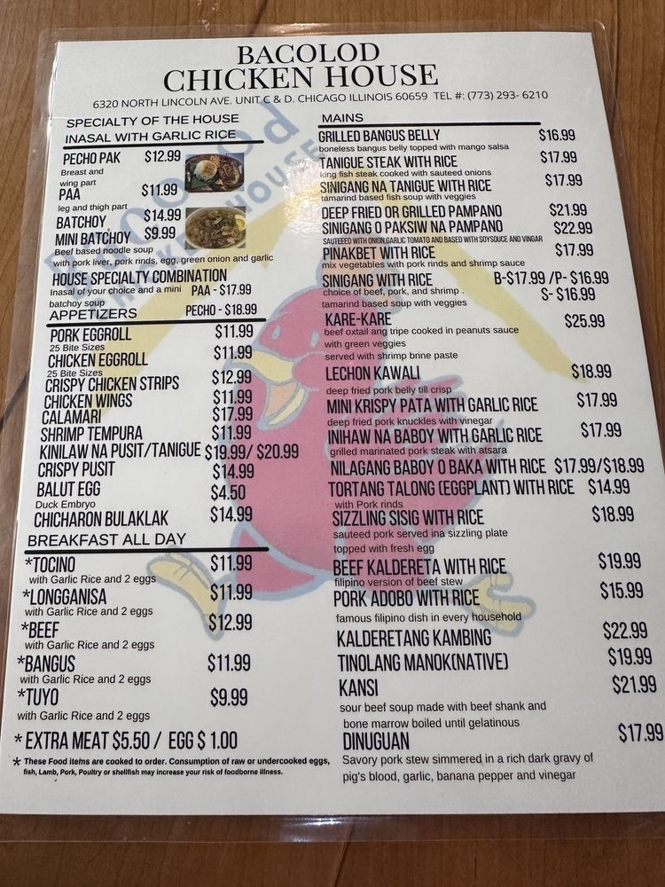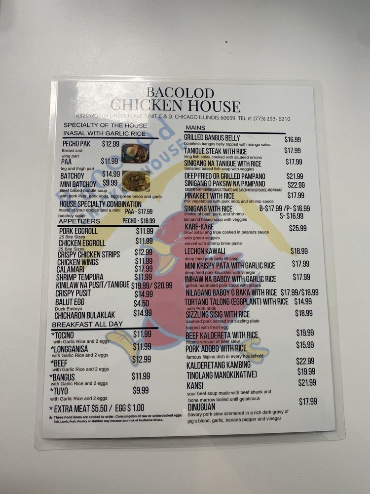 Introducing Bacolod Chicken House, a Filipino restaurant located in Chicago. Known for its authentic dishes and focus on specialties from a specific region in the Philippines. Offering a wide range of menu items, from breakfast all-day options like Tocino and Longganisa to appetizers like Pork Lumpia and Crispy Chicken Strips. Specialty dishes include Pecho Pak and Batchoy, a beef-based noodle soup with pork, liver, and more. Customers rave about the delicious flavors and authentic taste of the food. The restaurant also offers a unique dining experience with options like a boodle fight, where diners eat with their hands. If you're looking for a taste of Filipino cuisine in a casual setting, Bacolod Chicken House is the perfect choice.