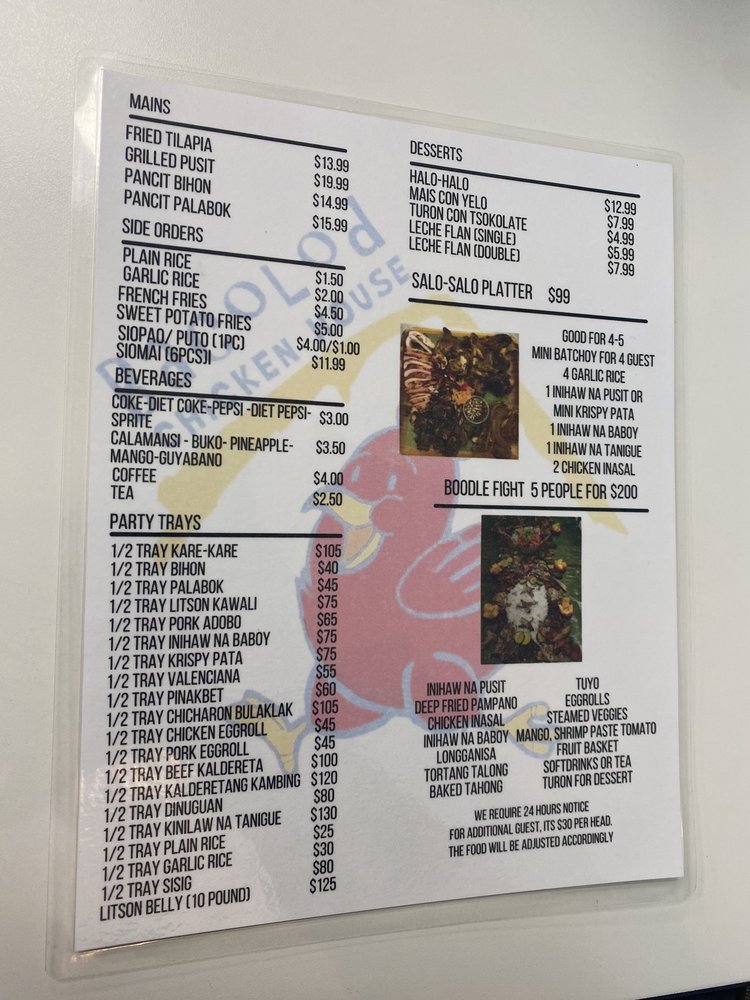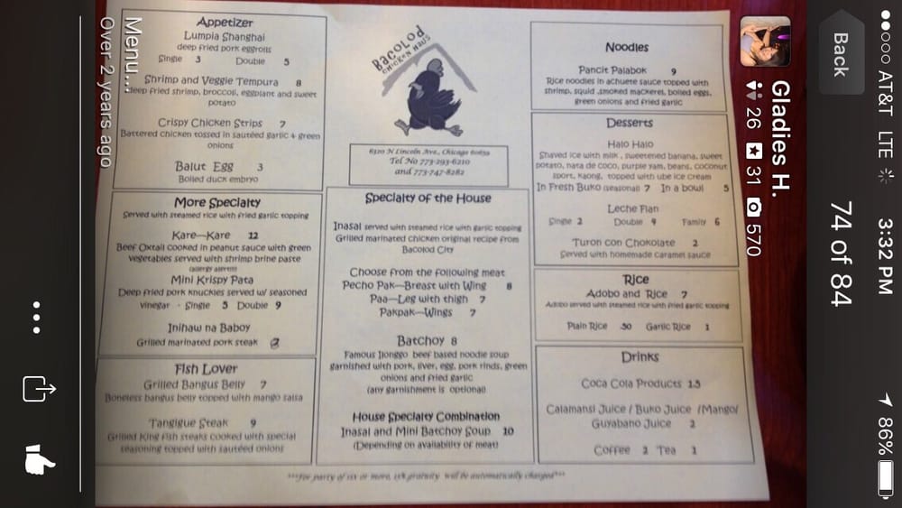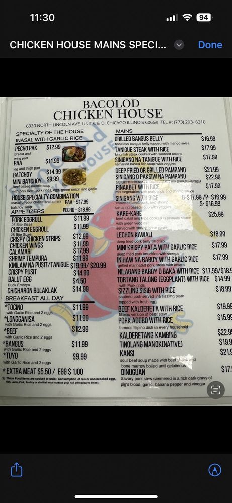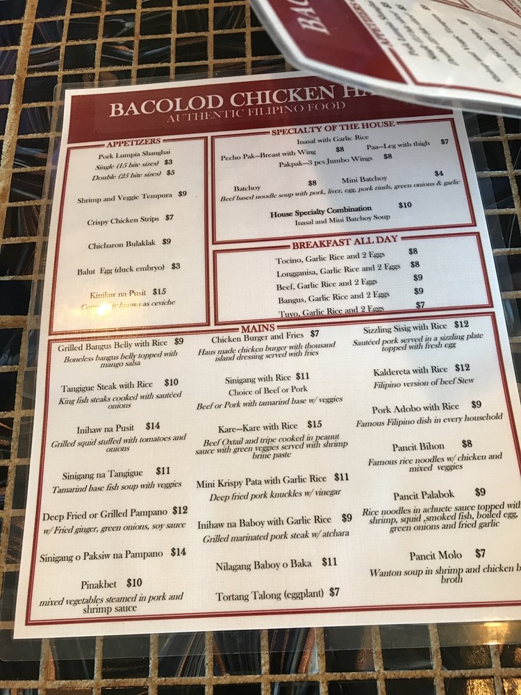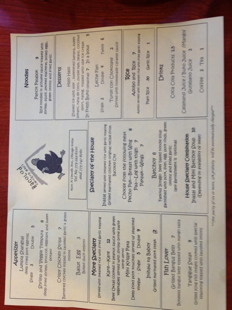 Introducing Bacolod Chicken House, a Filipino restaurant located in Chicago. Known for its authentic dishes and focus on specialties from a specific region in the Philippines. Offering a wide range of menu items, from breakfast all-day options like Tocino and Longganisa to appetizers like Pork Lumpia and Crispy Chicken Strips. Specialty dishes include Pecho Pak and Batchoy, a beef-based noodle soup with pork, liver, and more. Customers rave about the delicious flavors and authentic taste of the food. The restaurant also offers a unique dining experience with options like a boodle fight, where diners eat with their hands. If you're looking for a taste of Filipino cuisine in a casual setting, Bacolod Chicken House is the perfect choice.